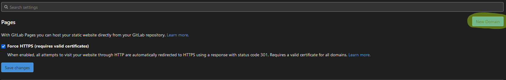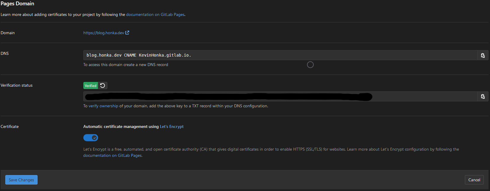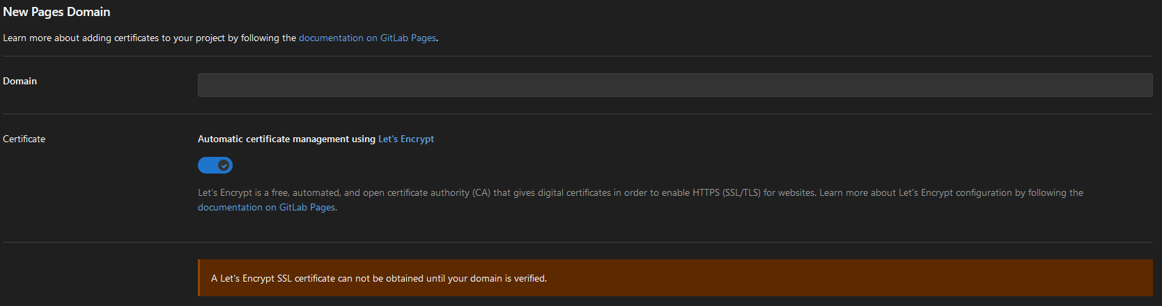 Es muss beim DNS Provider ein CNAME Record angelegt werden, der auf Gitlab Pages zeigt und ein verification code muss noch im DNS hinterlegt werden, damit Gitlab sicherstellen kann, dass man auch wirklich die Domain besitzt und nicht irgendwelche schlimmen Dinge anstellen möchte.